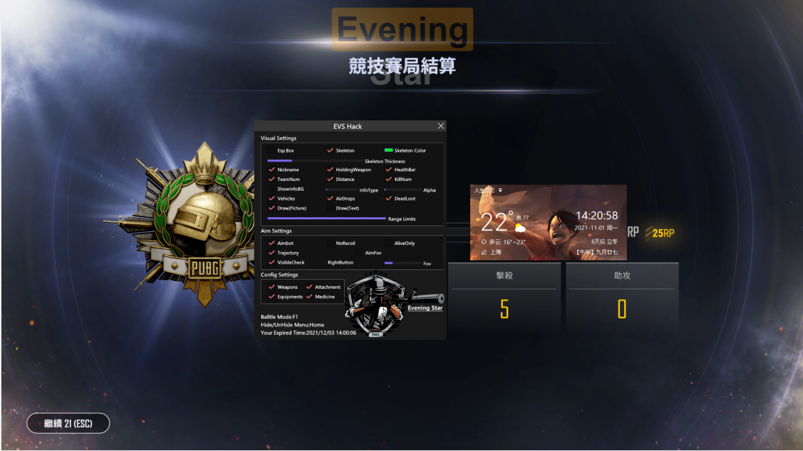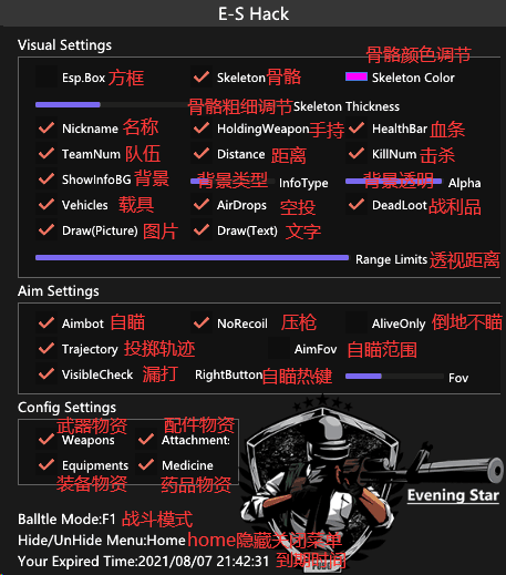 EVS透视:骨骼、名字、血量、击杀、距离、队伍、被瞄预警、掩体变色、小地图雷达,手持武器,敌人观战,地图雷达