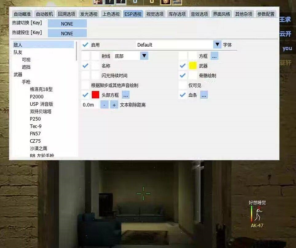 主要功能:人物方框-显示武器-人物血条-精准自瞄-自瞄键位切换-人物热能-0掉帧丝毫不卡