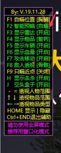 比如说带有预判自瞄的功能只需打开步枪狙击枪的瞄准镜同时对着敌人按住右键,鼠标就会锁住敌人即时开枪就行了会枪枪到肉,人物透视这些只需要按照辅助开关打开关闭即可,按照自己喜好的娱乐功能开关想要的功能即可放心去开始游戏来丰富业余生活,增加游戏体验。